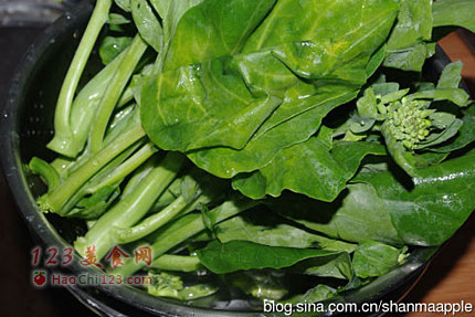 2、如果不喜欢芥兰的青菜味道,可以将切好的芥兰先焯一下再炒,但是一定焯的时间要短。