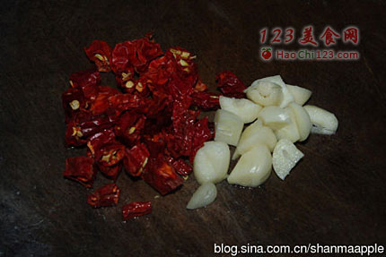 3、干红椒切段,蒜切粗米。