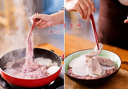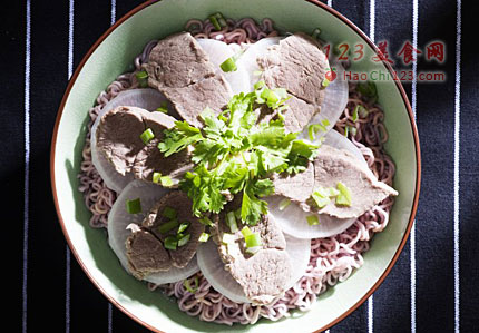 6、煮熟后将面盛入碗中,依次铺上白萝卜片和羊肉片。