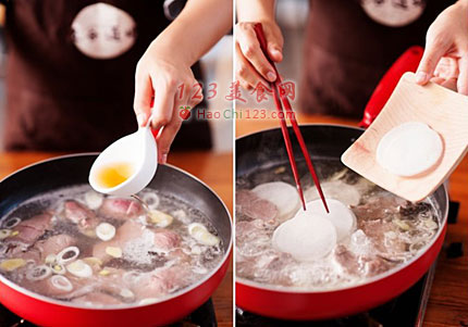 2、锅中加适量水烧开,放入姜片、葱片,煮沸后放入羊肉片。