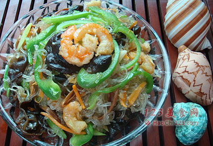2、葱姜爆锅、入虾仁、黑木耳、黄花菜、青椒、红萝卜、芹菜翻炒片刻。