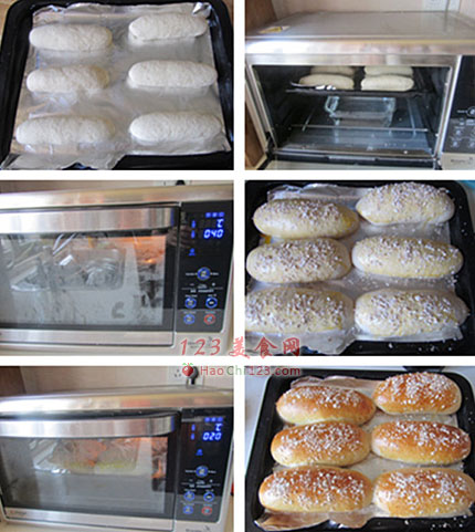 2、放入烤箱中发酵,记得要放上一碗开水,保持湿润的环境,直至到八分;拿出来刷层蛋液,撒些燕麦片,放入预热160度的烤箱中,烘烤20分钟即可。