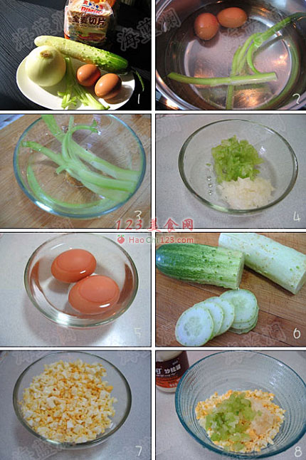 8、洋葱碎、芹菜碎和鸡蛋碎混合。