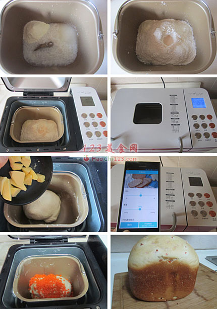 2、采用后油法,先将除黄油外所有材料一个搅拌程序,再加入黄油,就可以选择米饭面包制作一键完成;中途过程如想添加食材,干果、果仁、蔬菜丁等,面包机会有提示的滴滴声音,其它最后完成时也会滴滴提示。