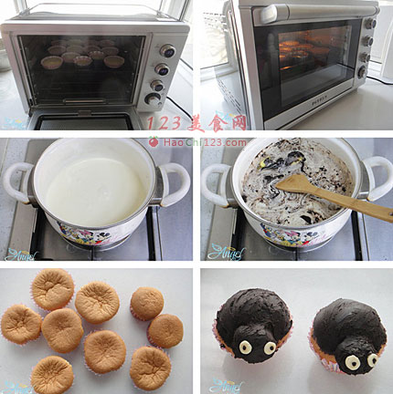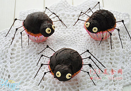 15、冷却的巧克力在蛋糕上抹一大一小两个球做蜘蛛的身体,白巧克力币做眼睛,黑巧做眼珠。
