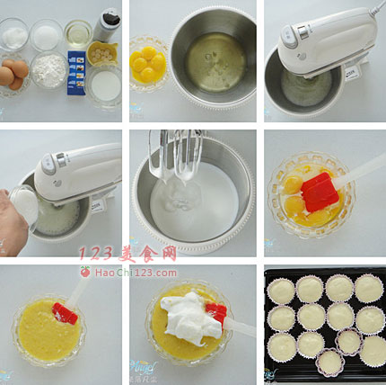 9、然后倒入或者用裱花袋挤入纸模中,软的纸模下面要放上硬模垫底固定,稍微震出气泡。