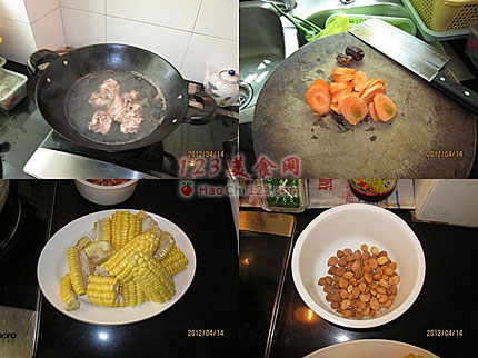 2、玉米剥小段,胡萝卜去皮切块,姜切片,南北杏洗净备用。