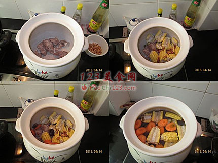 3、锅里放入猪骨,再加入玉米、南北杏,最后加入胡萝卜、姜片、蜜枣和3000ml的水。