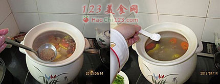 4、大火烧开,用勺子撇去煲猪骨煲出的泡沫,盖上锅盖转小火慢煲2个小时。