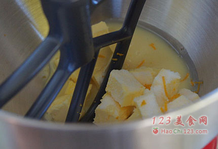 2、加入面粉和泡打粉,慢速搅拌至材料混合均匀成团。