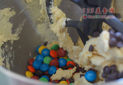 3、加入巧克力豆,偶放了一半巧克力豆,一半M&M,继续搅拌均匀。