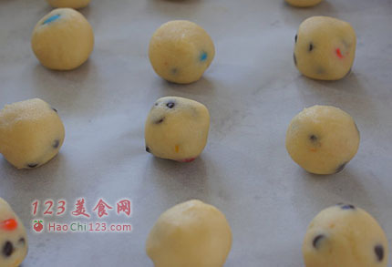 5、把小球们放在铺有烘培纸的烤盘上,每个间距5厘米。