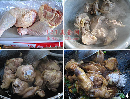 3、油热后,倒入控干水份的鸡腿翻炒。
