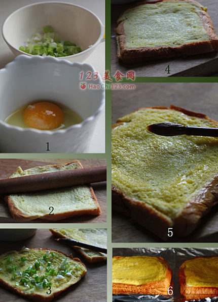 3、鸡蛋打匀,用毛刷(我是用的是毛笔赫赫)蘸蛋液刷在面包片上,洒上葱花。