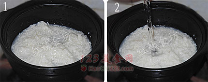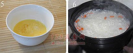 6、鸡蛋打散后,锅内的酒酿就煮开了。