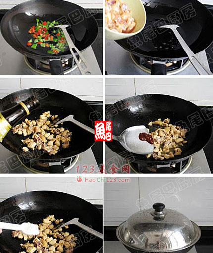 6、倒入鸡丁,翻炒。