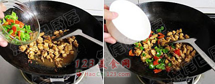 11、倒入辣椒丁。