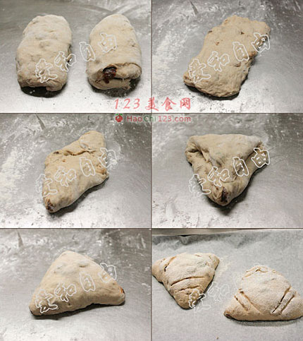 6、三角形的整法还可以象包糖三角一样,事实上我第一次做这款面包时就使用的是糖三角的整形方法,不过那种做法容易把面包做得很扁。