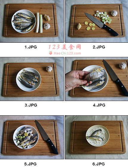 6、面粉与淀粉混合,将腌好的鱼抖落葱姜,放入粉中。