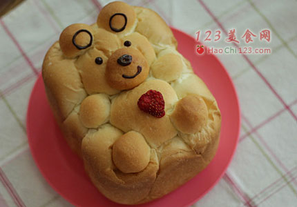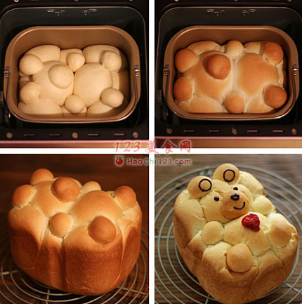 5、依照上图1-5层的顺序,将面团摆在面包桶中。第五层是用没有包馅的那个面团,分成7小份,滚圆放在中间的面团上面和四周,当作小熊的鼻子,耳朵,手和脚。