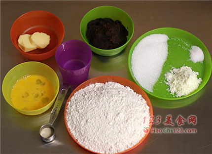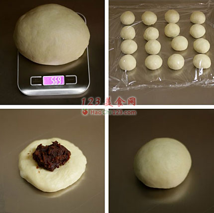 4、取一份面团擀开,翻面,放上馅料包好,接口朝下放置,依次包好15份面团。记得留下那个稍大的面团,是不包馅的。
