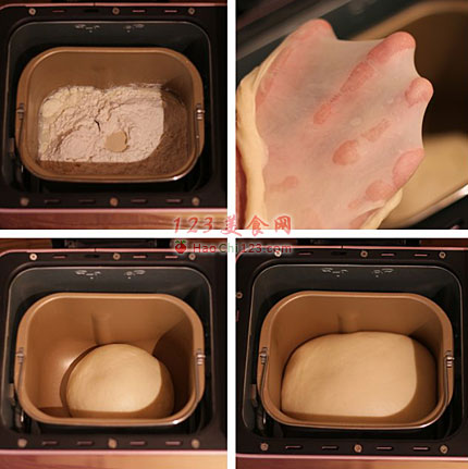 2、取出搅拌刀,将面团滚圆后放回面包桶内,选择“米酒”发酵至面团长大到2-2.5倍。
