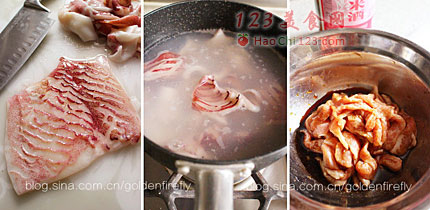 2、花枝入滚水中,烫约20秒后捞起沥干备用。