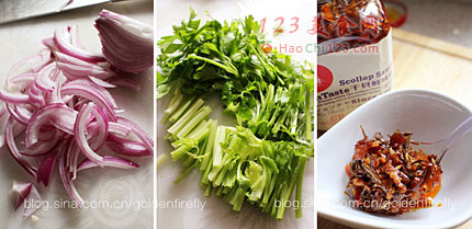 4、洋葱切丝;芹菜洗净切小段(梗段与叶段分开);备好XO酱。