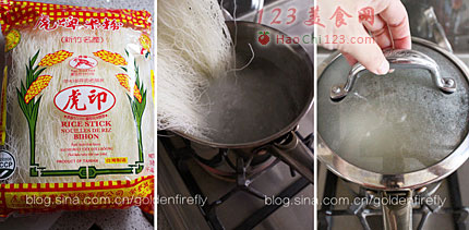 5、煮一锅滚水,米粉入滚水中煮约1分钟,后即刻将滚水全部倒出。后加盖焖约5分钟。