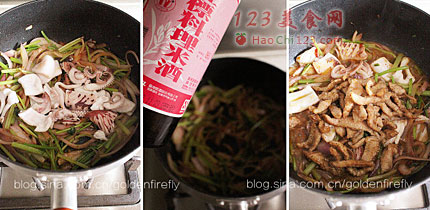 8、加入干贝XO酱花枝块+米酒+花枝块+八成熟的肉丝,拌炒出香气。