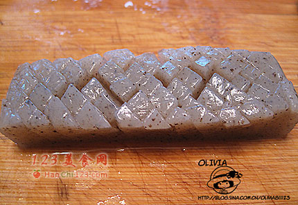 第二种魔芋加工法:这个很简单,看图就能明白,十字花刀,再切成小块即可。