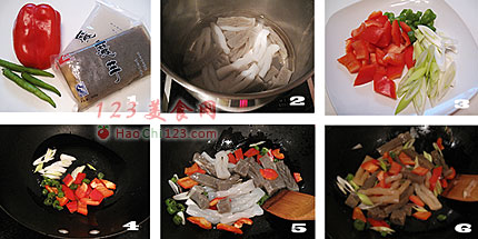3、把彩椒洗净,斜刀切块;尖椒洗净切成尖椒圈;大葱斜刀切段。