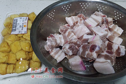 4、开火炒锅入少油,小火,入冰糖,待熬至融化时,放入肉块翻炒上色。
