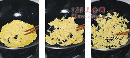 6、如图这样,将鸡蛋炒散成鸡蛋花。