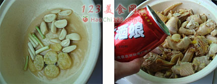 3、加入鸡块香菇翻炒,感觉炒至快干,下生抽炒匀,倒入一听酒娘。