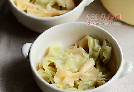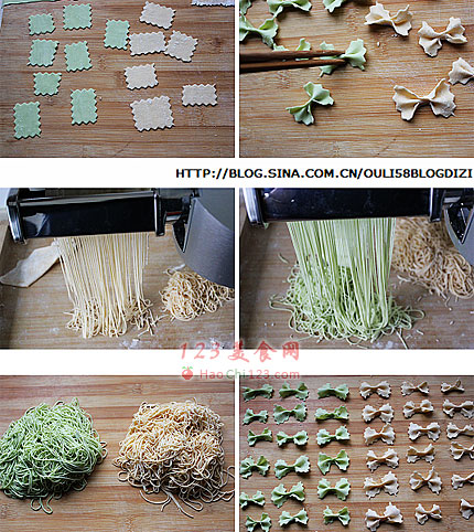 6、用抡刀将大面片切成花边小面片,用筷子一夹,即成蝴蝶面。