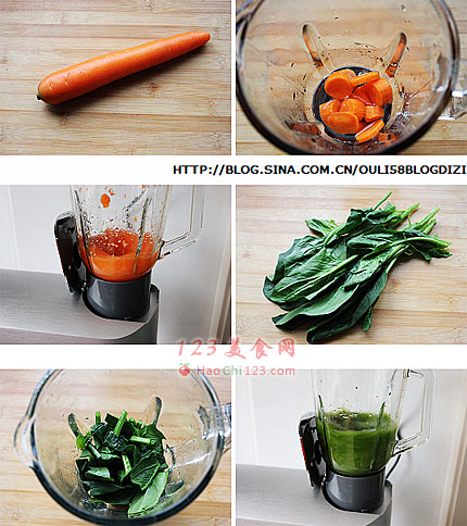 2、菠菜切段,放入料理杯里榨成菠菜汁。