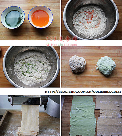 5、用卡厨师机配带的压面机头,将面团分别压成面片。