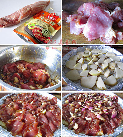 5、再把肉片铺在土豆上。