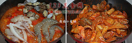 9、放入花蛤、虾、鱿鱼。