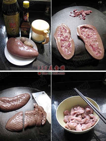 2、另外,洗的步骤也很重要,切好的腰花在洗的时候,要用手挤一下,尽量把腰花里的血水挤出来,这样洗出来的腰花会比较白,炒出来不但没有臊味,并且颜色也很漂亮。