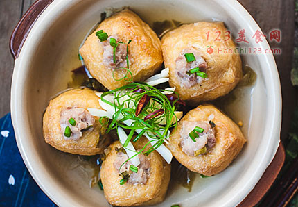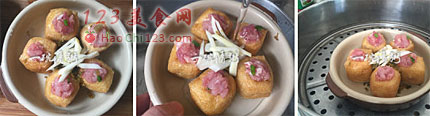 3、蒸之前要放适量的清水(没过油豆腐的1/3),油豆腐的吸附能力比较强,只靠肥肉的油脂,蒸出来的油豆腐塞肉会比较干,所以最好放一些清水。[sushi.laoyanhuo.com]