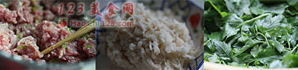 3、肉糜加葱姜碎、鸡蛋、黄酒、糖、盐拌匀。