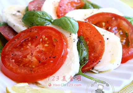 4、将奶酪、西红柿、九层塔按照交错的方式摆盘,浇上调好的调味料即可。