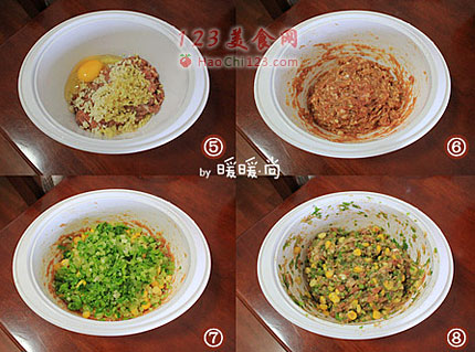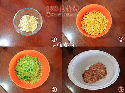 7、往肉馅里加入剥好的玉米粒和切好的芹菜丁。