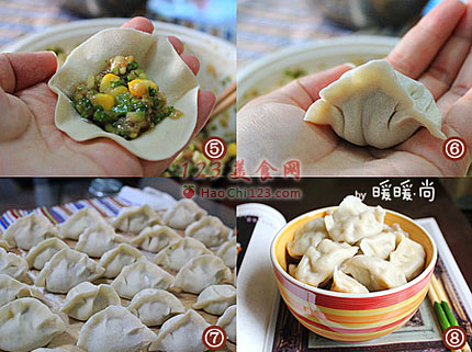 5、6、包入适量的饺子馅,先将中间捏紧,再用两手将两边往中间挤,同时两个大拇指和食指用力将两边的边边捏紧即成。