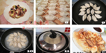 9、平底锅中放入适量食用油,把饺子均匀的放在锅中,煎5分钟左右。