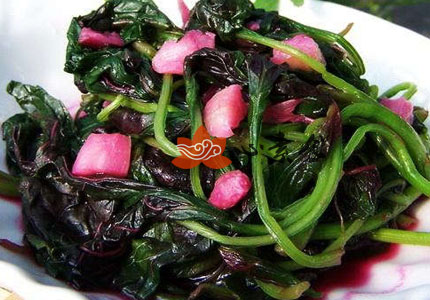 3、倒入红苋菜翻炒,使苋菜受热均匀。