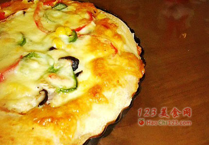 12、放进预热好200度的烤箱烤焙,中层,20分钟后即可吃到香喷喷的批萨了。