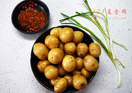 2、将小土豆一一用刀、勺子或拇指按扁。